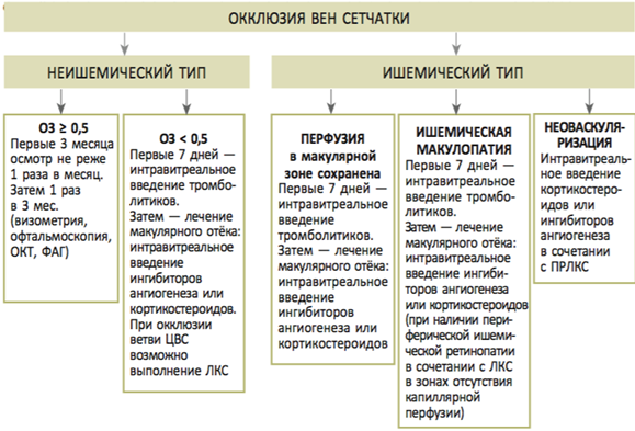 Для оценки вида ОВС чаще всего используются данные, полученные при ФАГ. Критерием оценки состояния является площадь отсутствия капиллярной перфузии. При ишемическом типе окклюзии ветви ЦВС она обычно превышает 5 площадей ДЗН, а при окклюзии главного ствола – 10 площадей ДЗН.