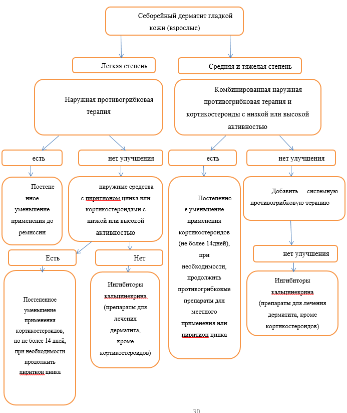 Блок схема 2. Алгоритм действий врача при ведении взрослых пациентов с себорейным дерматитом кожи лица, туловища.