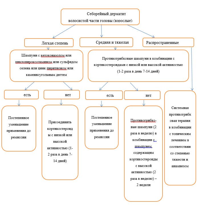 Блок схема 3. Алгоритм действий врача при ведении взрослых пациентов с себорейным дерматитом волосистой части головы или распространенных высыпаниях.