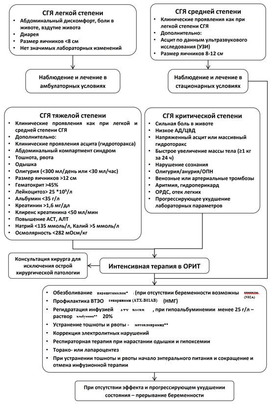 Критерии установления диагноза: СГЯ диагностируют при развитии асцита (и/или гидроторакса), увеличения в объеме яичников (>6 см3) на фоне овариальной стимуляции.