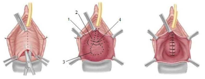 Операция проводится в специализированном стационаре при наличии обученного гинеколога или уролога. Наркоз – внутривенная тотальная анестезия или спинальная анестезия.