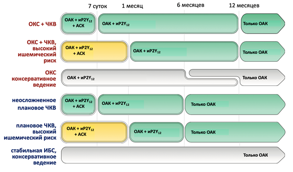 Интерпретация (ключ): ≥ 25 баллов – высокий риск кровотечений, рекомендуется сокращенная длительность комбинированной антитромбоцитарной терапии; <25 баллов – низкий риск кровотечений, рекомендуется стандартная длительность комбинированной антитромбоцитарной терапии