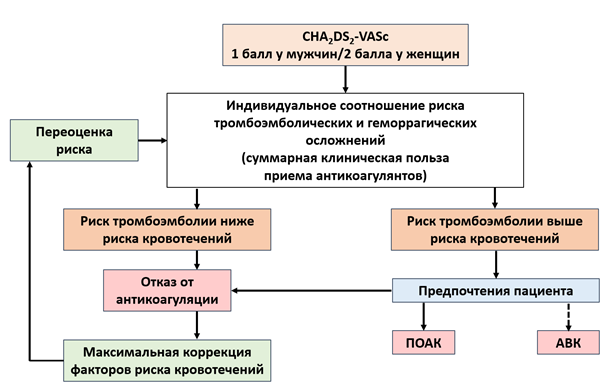 стратификация риска инсульта (согласно шкале CHА2DS2-VASc);