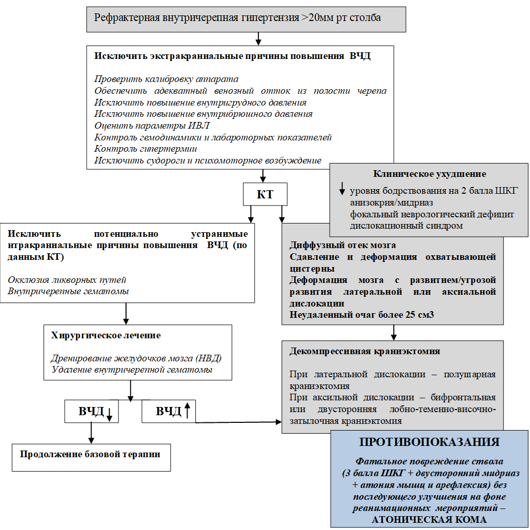 а) вторичные интракраниальные повреждения являются результатом воздействия таких факторов, как нарушение проницаемости ГЭБ, увеличения объема мозга или его набухания вследствие отека, гиперемии или венозного полнокровия, повышения интракраниального давления, смещений и деформаций мозга, отсроченных гематом (эписубдуральных, внутримозговых), нарушения гемо- и ликвороциркуляции в результате субарахноидального или внутри желудочкового кровоизлияния, внутричерепной инфекции и др. б) вторичные экстракраниальные факторы: артериальная гипотензия, гипоксемия, гиперкапния, анемия и др. [Reilly P., Bullock R., 2005]. Вторичные факторы могут быть предупреждены или излечены, что зависит от своевременной и правильной диагностики, организации и качества нейрохирургической помощи.