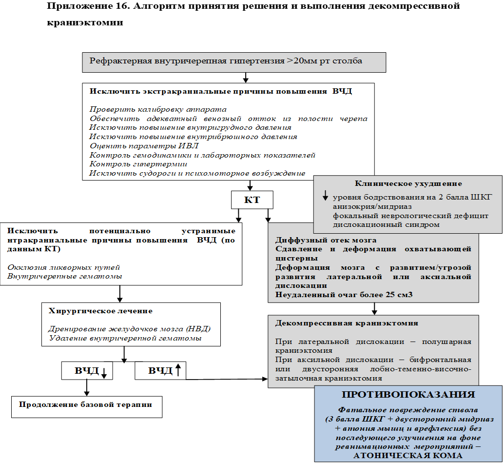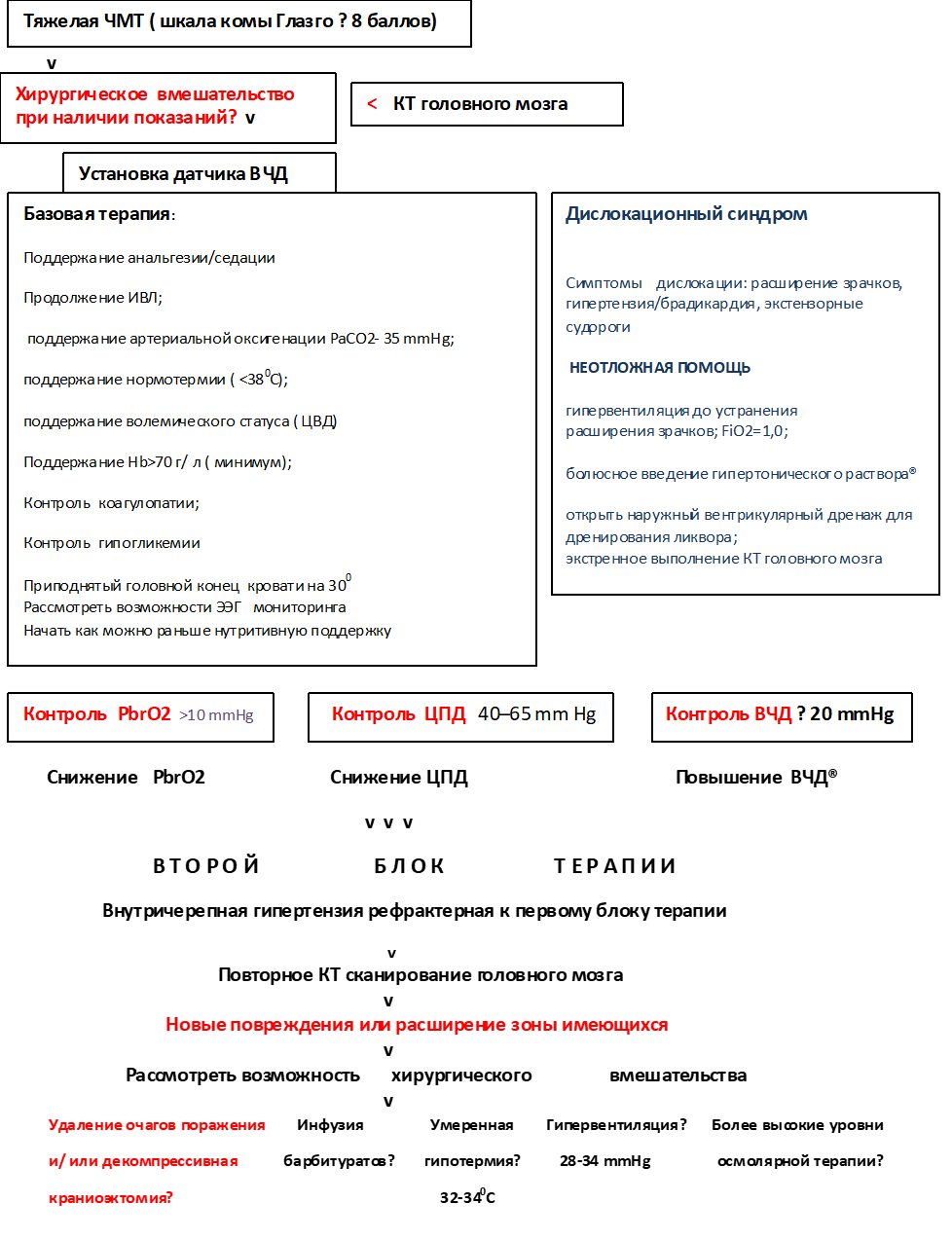 Комментарии: При первичной оценке состояния пациента с тяжелой ЧМТ необходимо установить ее характер (закрытая/открытая; проникающая/непроникающая; изолированная/сочетанная/комбинированная) и субстрат повреждения (ДАП/очаги ушибов/оболочечные гематомы; повреждения костных структур; наличие или отсутствие субарахноидального кровоизлияния; а также подробно описать повреждение мягких тканей и экстракраниальных структур (грудная/брюшная полость; шейный отдел позвоночника; скелетная травма, таз).