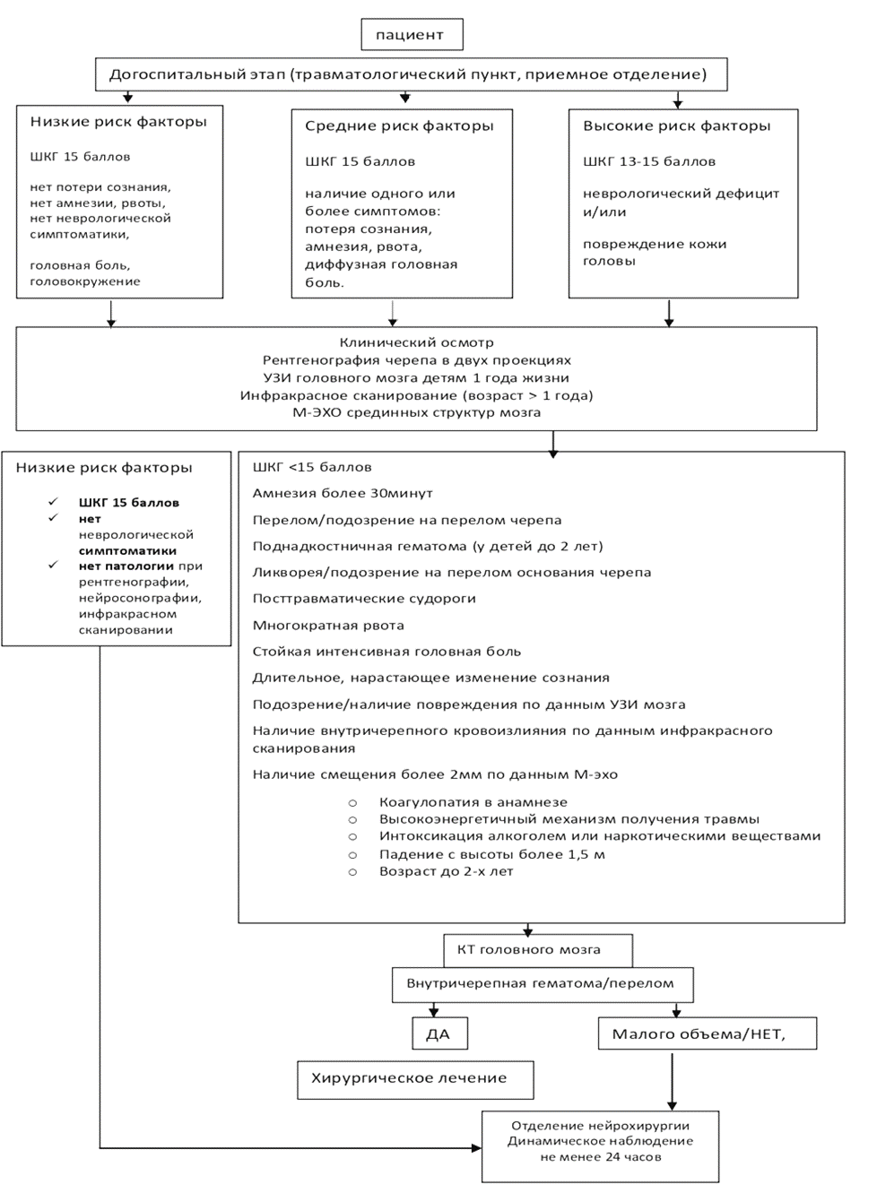 • Рекомендуется осмотр врача-нейрохирурга (либо специалиста, оказывающего неотложную помощь) детям, получившим травму головы, либо имеющим подозрение на травму мозга для оказания неотложной специализированной помощи [1,9,10].