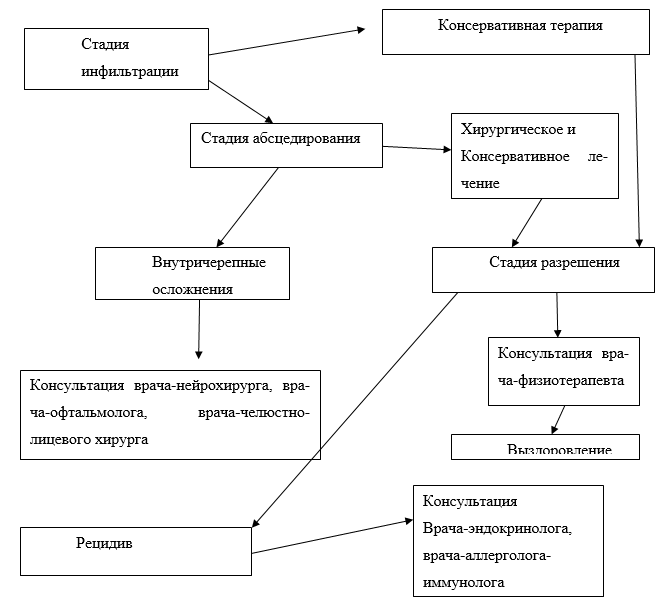 Комментарии: при распространении воспалительного процесса на область лица целесообразен прием (осмотр, консультация) врача- челюстно-лицевого хирурга [30, 31].